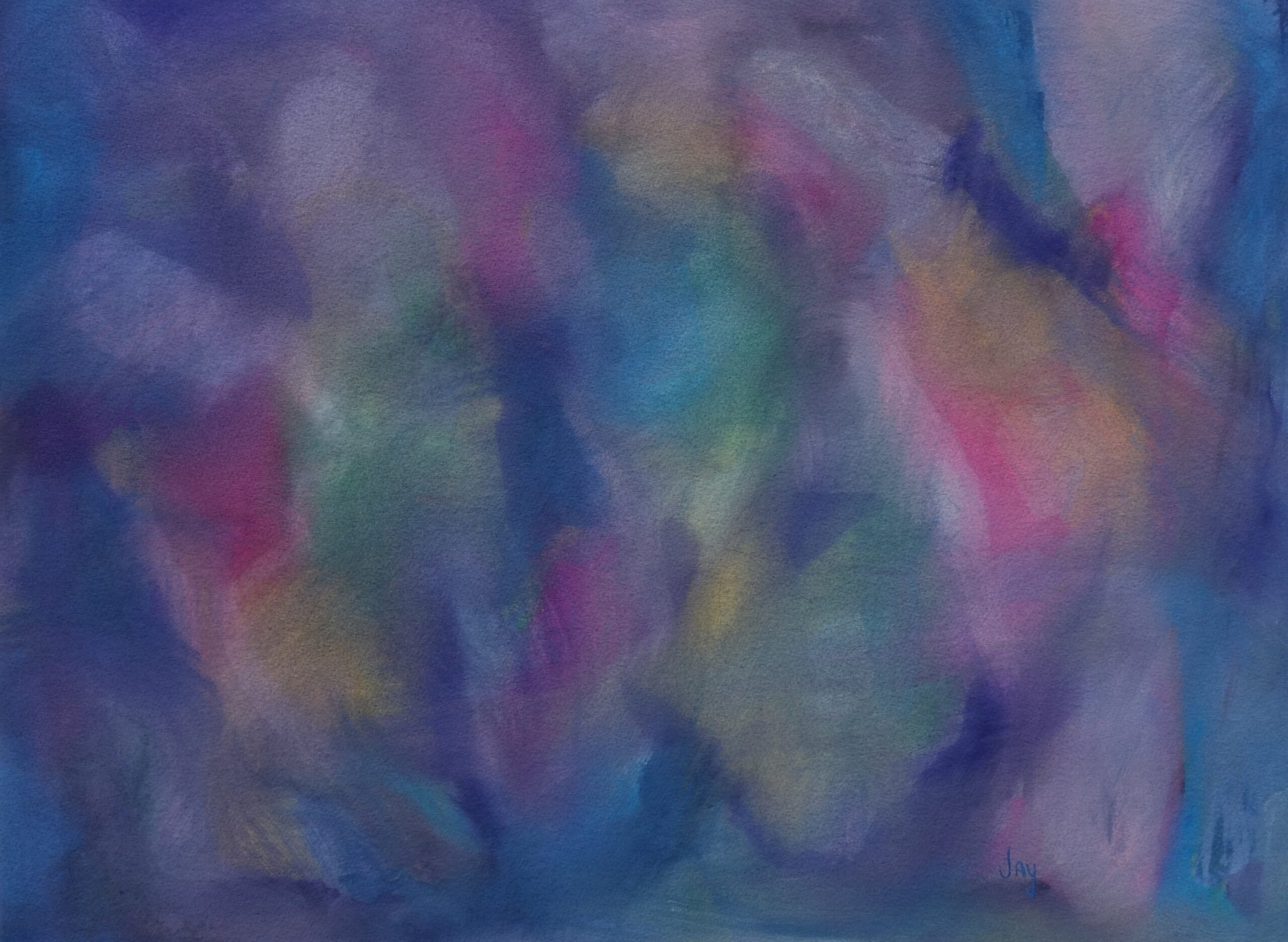 “First Responders” is a deeply atmospheric abstract watercolor painting that evokes a sense of blurred motion and emotional intensity through its soft, diffused forms and layered hues. Dominated by deep blues and purples that create a nocturnal, almost twilight-like depth, the composition features swirling, indistinct shapes suggesting human figures in dynamic action—perhaps rushing forward or clustered together—emerging from and dissolving into misty veils of color. Accents of vibrant pink, magenta, turquoise, and golden-green punctuate the cooler tones, adding flickers of urgency, warmth, and life amid the ethereal haze, as if capturing the flashing emergency lights or the vital energy of those in crisis response. The overall effect is dreamlike yet poignant: boundaries between individuals and their surroundings melt away in wet-on-wet washes and delicate dry-brush textures, conveying both the chaos of emergency and the quiet solidarity of collective effort, all rendered with a luminous, glowing translucency characteristic of watercolor on paper. The work feels intimate and personal while honoring its heroic subject through abstraction rather than literal depiction.