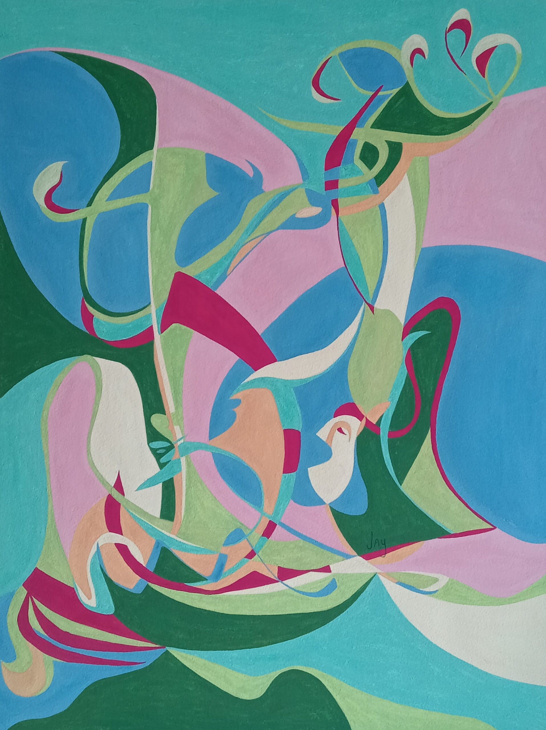 “Kissing a Fool” is a exuberant, flowing watercolor painting that pulses with playful eroticism and whimsical grace against a vibrant turquoise ground. Intertwined, sinuous ribbons of pastel pink, emerald green, sky blue, peach, and magenta twist and loop in an elegant, almost calligraphic dance, suggesting two figures locked in an intimate embrace—or perhaps a single form caught in ecstatic self-embrace. Long, curving tendrils sweep upward like tender arms or lovers’ hair, while softer, bulbous shapes evoke lips, cheeks, or breasts gently pressing together; the composition spirals and folds inward toward a central, warm nexus of overlapping hues where the kiss seems to occur, yet never quite resolves into literal anatomy, preserving instead a delicious ambiguity. Bold negative spaces of turquoise breathe through the tangle, allowing the eye to trace the fluid momentum of each ribbon as it dips, rises, and caresses its counterpart, creating a sense of perpetual, joyous motion. The palette—fresh, candy-like yet sophisticated—radiates optimism and lighthearted mischief, as though the title winks at the viewer: foolishness in love is the sweetest kind. The work feels alive with affectionate humor and unapologetic sensuality, inviting the eye (and perhaps the heart) to linger in its colorful, curving reverie.