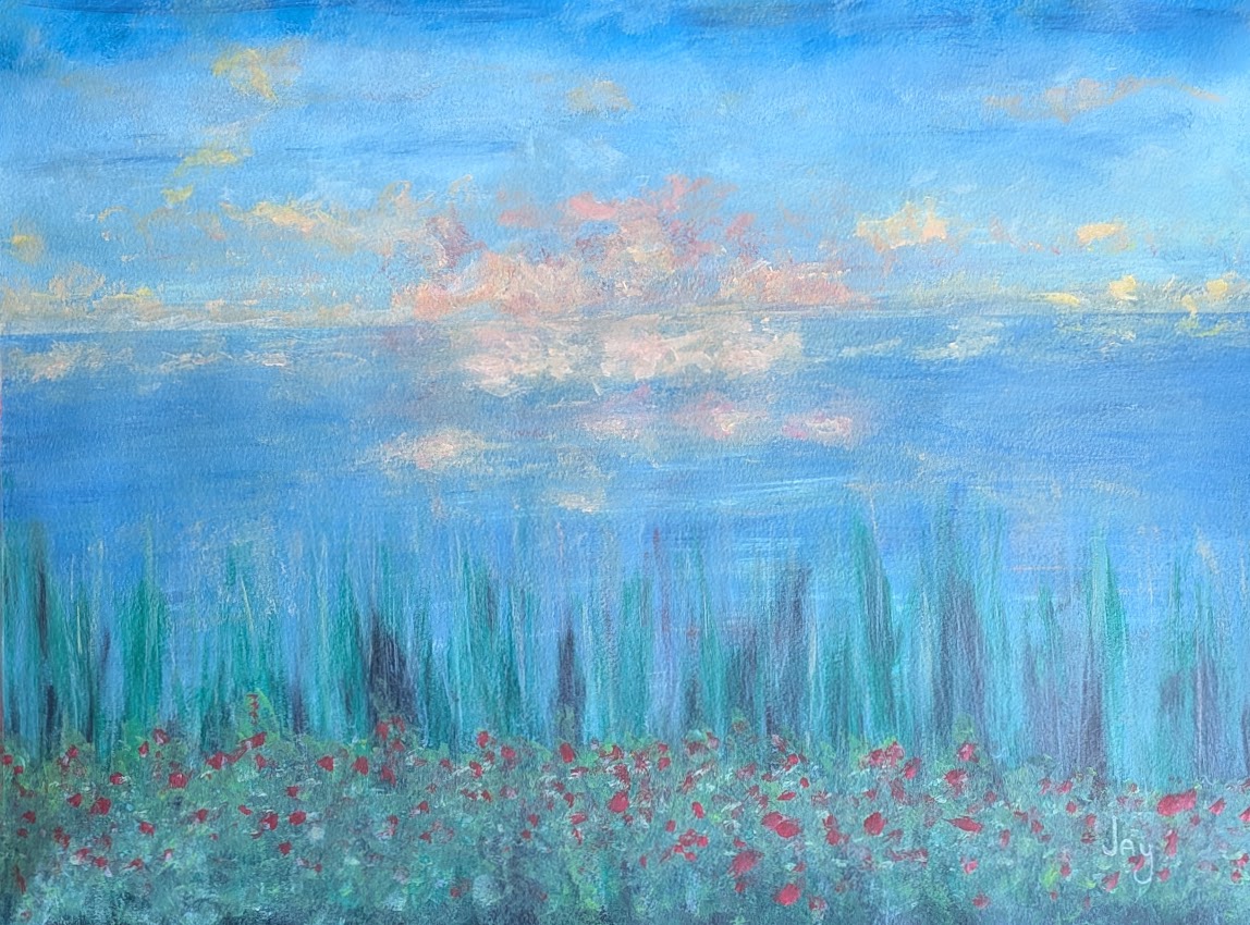 “Rose Hips on Coastal Shores” evokes a tranquil meeting of land and sea, where atmosphere matters more than detail. A soft, expansive sky in layered blues stretches across the canvas, tinged with delicate blushes of pink that suggest early morning or late evening light. Below, the horizon dissolves into a misty coastal band, rendered with vertical, almost dripping strokes that blur the boundary between water, grasses, and air. In the foreground, scattered bursts of deep red—suggestive of rose hips—punctuate the cool palette, adding warmth and a quiet sense of life amid the calm. The painting feels both grounded in nature and dreamlike, capturing not a precise place but the memory and mood of a coastal landscape.